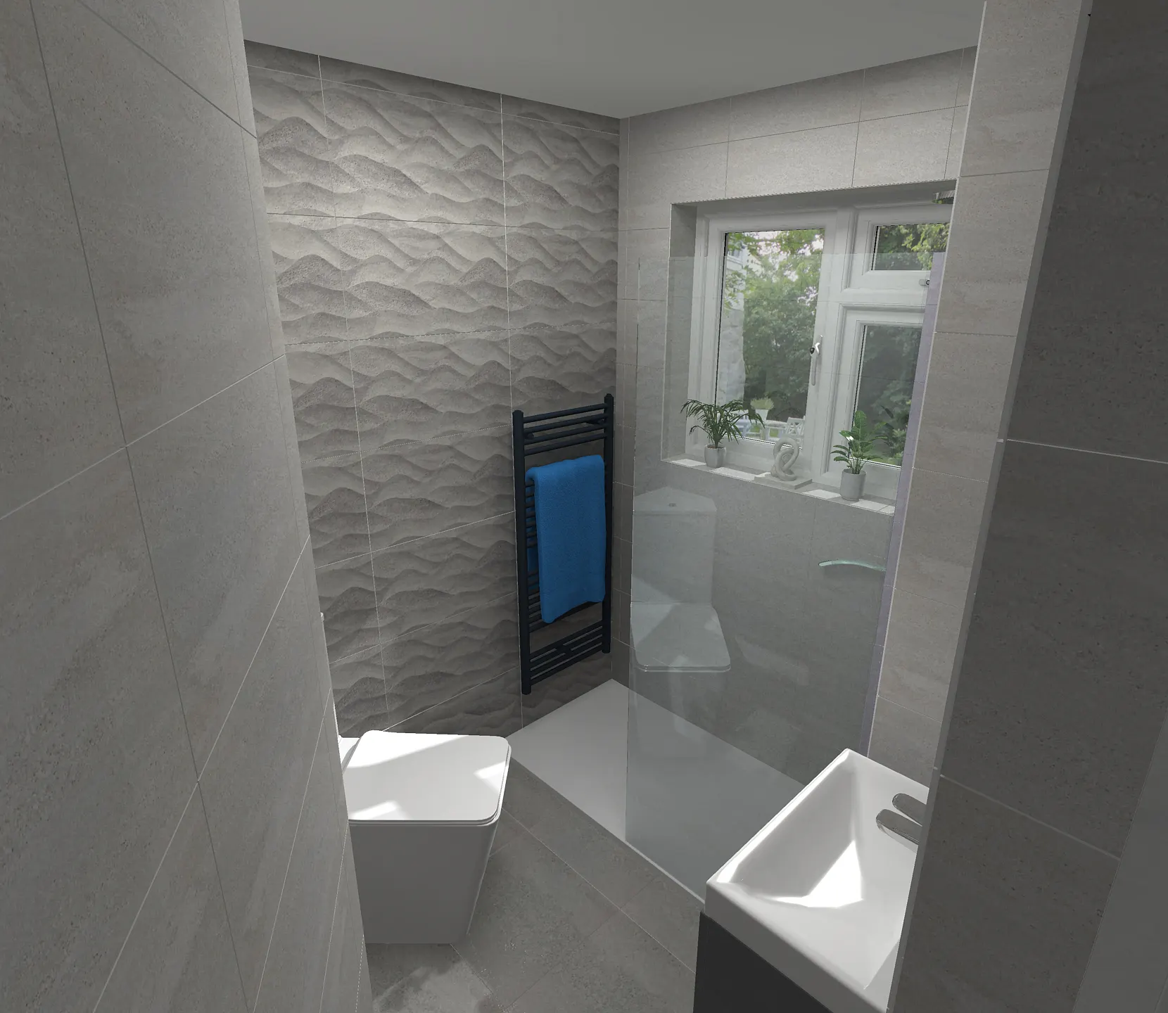 Chrome fixtures, including a rainfall head shower and a chrome lever basin mixer tap, provided the perfect accessible finishing touches, combining style and practicality. An anthracite towel rail was also installed for heating, matching the contemporary design.