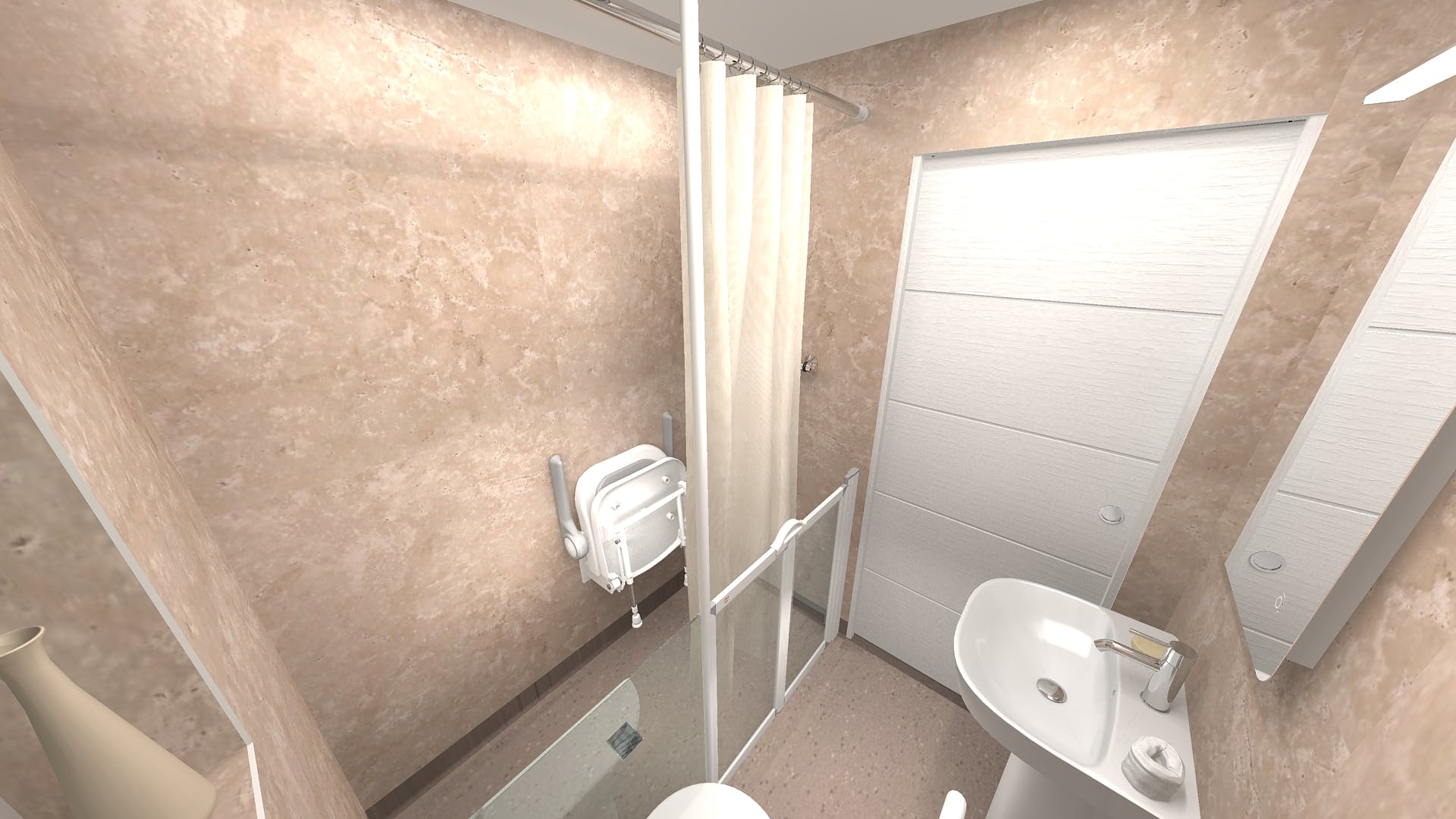 To achieve this, the bath was removed and replaced with a Pro-Forma wet floor tray and anti-slip Quattro flooring, creating a level-access shower area that offered both security and confidence. A folding shower seat was installed to ensure comfort during use, and because assistance would still be required, half-height shower screens with a curtain were incorporated—allowing carers to help safely when needed.