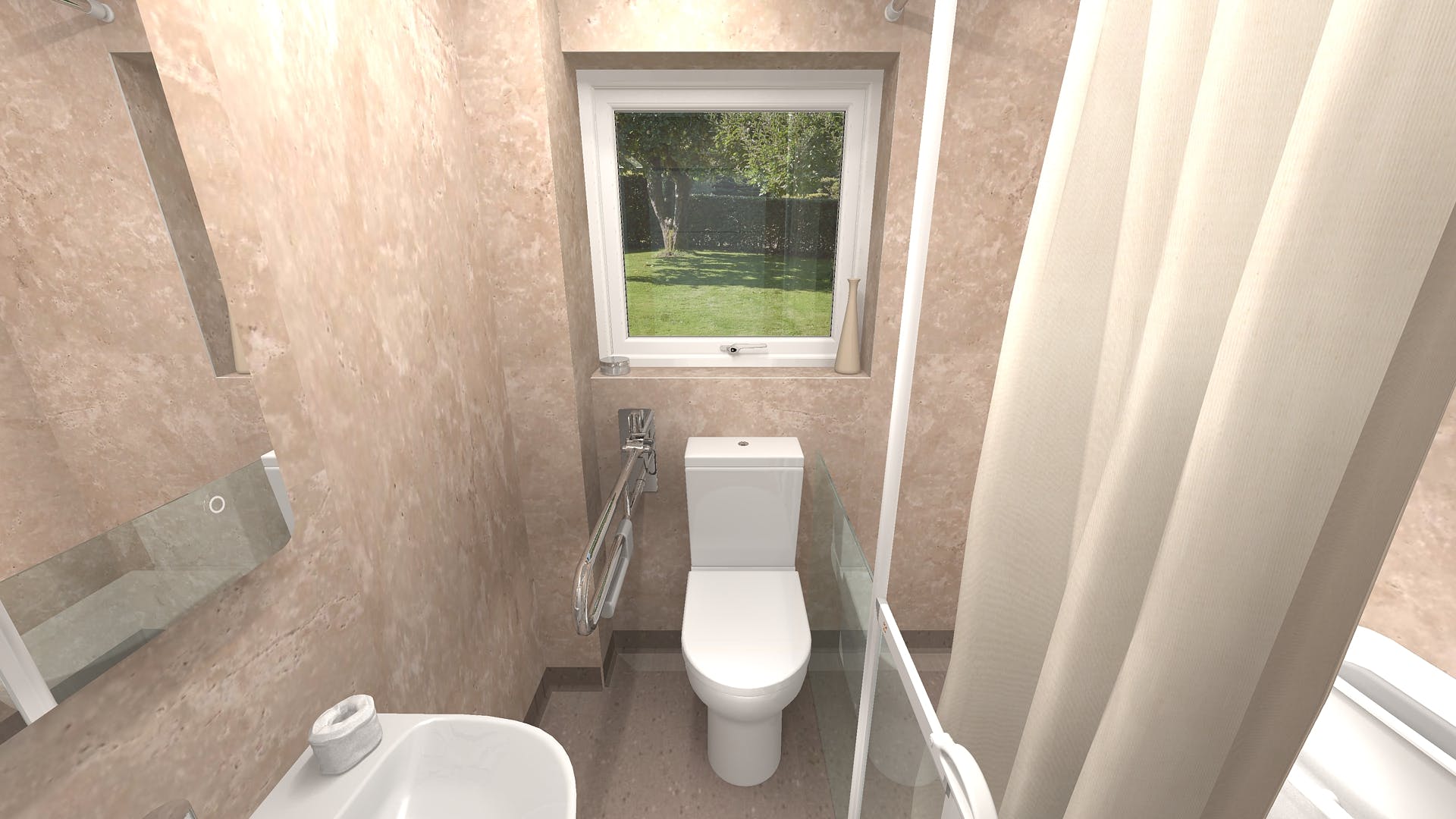 For added convenience, a PIR motion sensor was linked to the mirror light, automatically illuminating the room upon entry to provide safe lighting at all times, especially during night visits. The walls were cladded in Zest Ivory wall boards, chosen for their warm tone, hygienic finish, and easy maintenance. These complemented the Truffle Shore flooring, creating a clean, modern, and homely aesthetic.