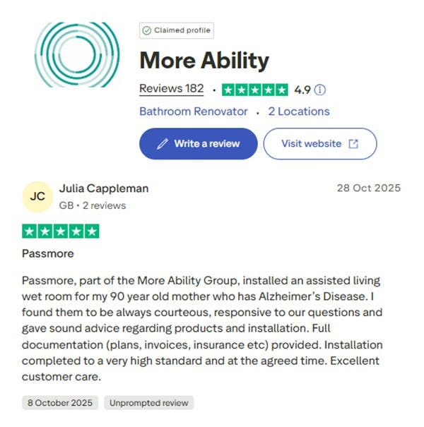 “Passmore, part of the More Ability Group, installed an assisted living wet room for my 90-year-old mother who has Alzheimer’s disease. I found them to be always courteous, responsive to our questions and gave sound advice regarding products and installation. Full documentation (plans, invoices, insurance etc) provided. Installation completed to a very high standard and at the agreed time. Excellent customer care.”
